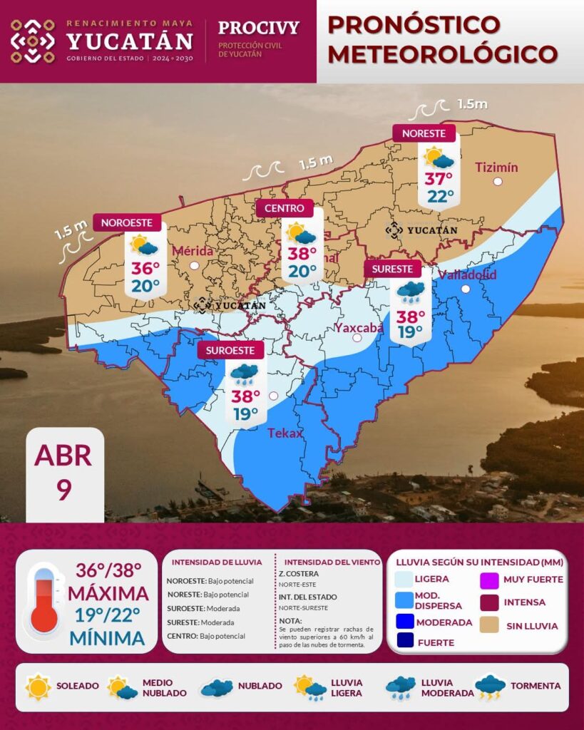 Hoy toca calor del bueno: máximas de 36°C a 38°C en casi todo el estado (en la costa menos). Pero no guarden el paraguas porque después de las 3 de la tarde se esperan lluvias, rachas de viento y truenos, principalmente para los que viven en el sur de Yucatán. El viento andará del norte y sureste a unos 20 km/h. ¡Cuídense del sol y del agua!